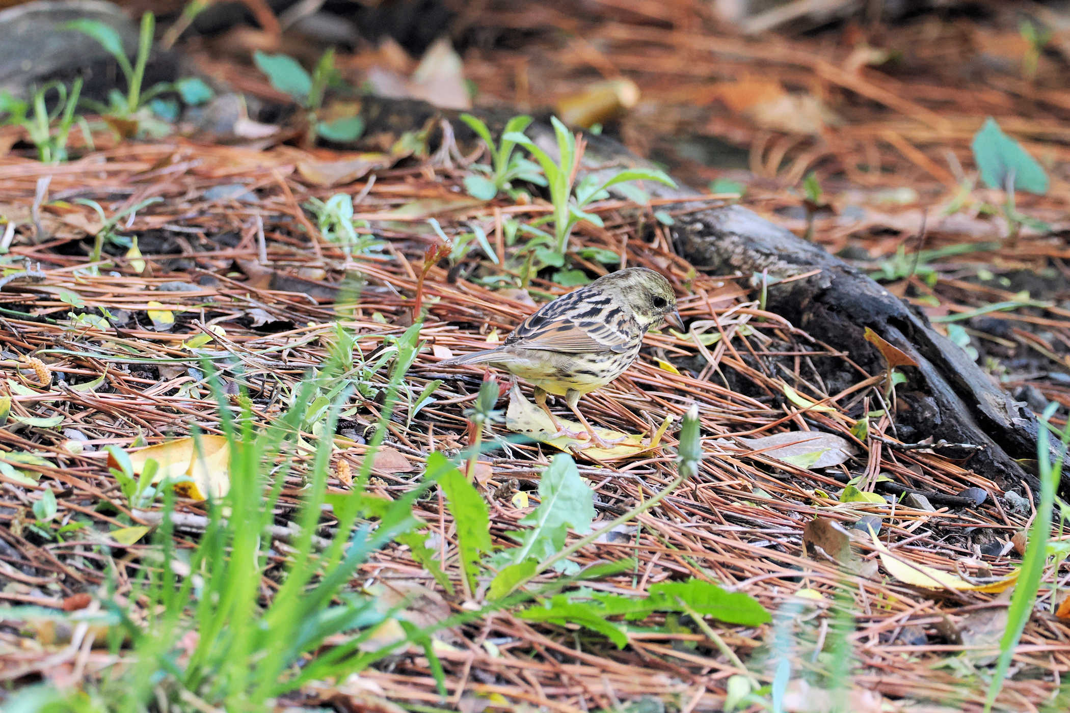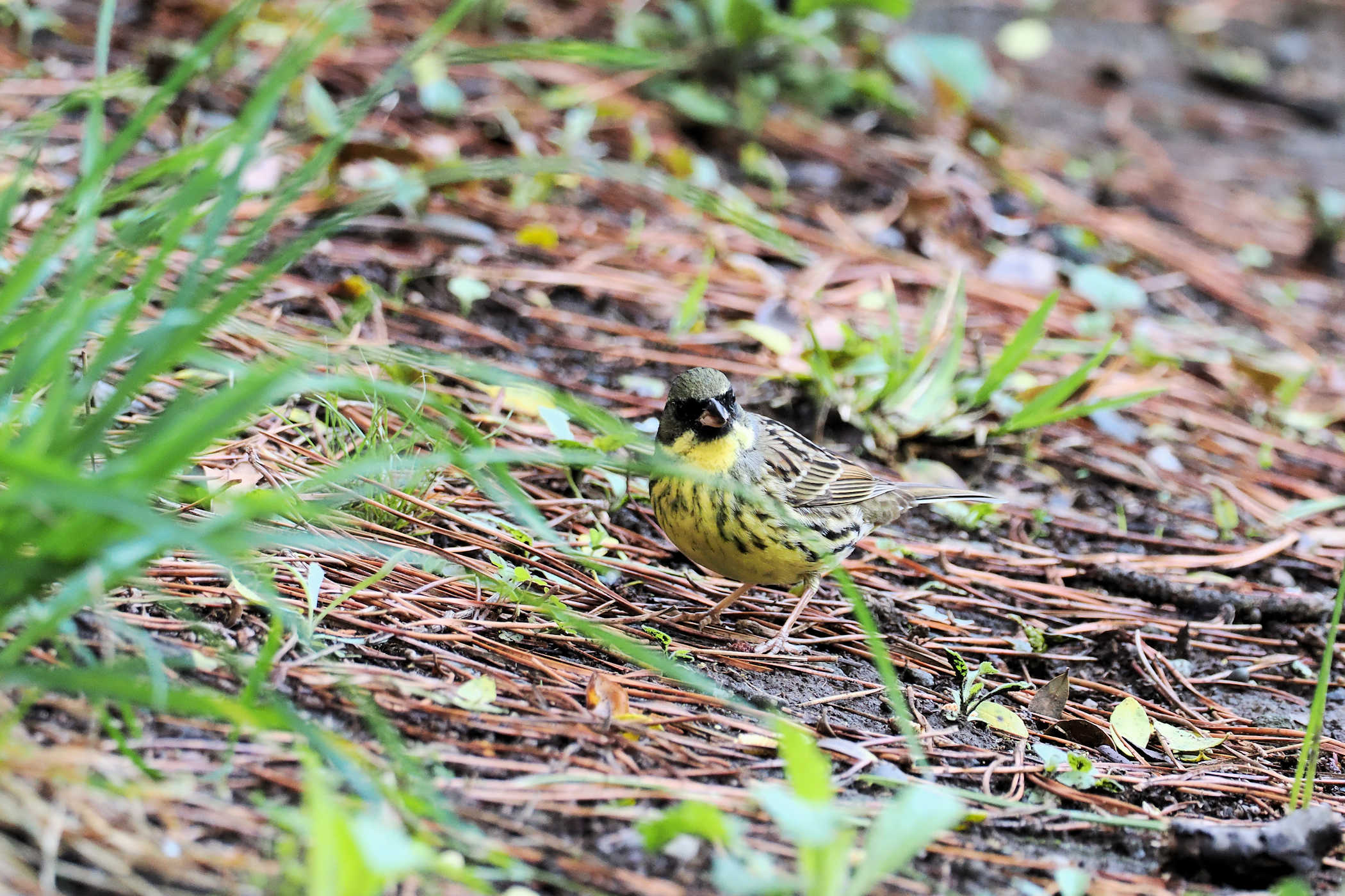ふと下を見ると地面で餌を探すアオジさん